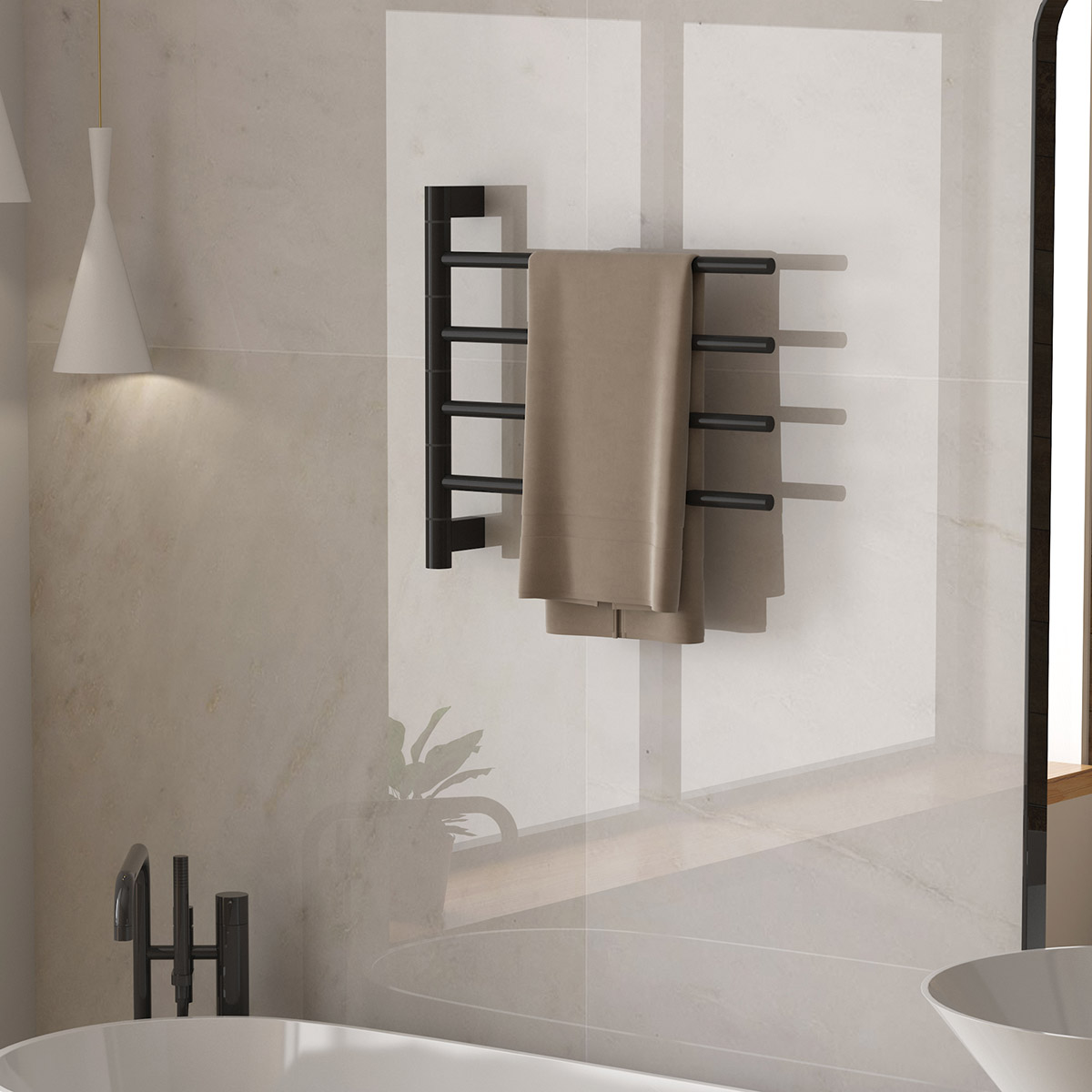 4桿電熱毛巾架 4 bar heated towel rail 材質Material:SS201/SS304 功率Power:220V/60W 表面Surface:Black Painted 黑色噴塑 尺寸Size:500*95*500mm 包裝Ctn size:520*60*520mm