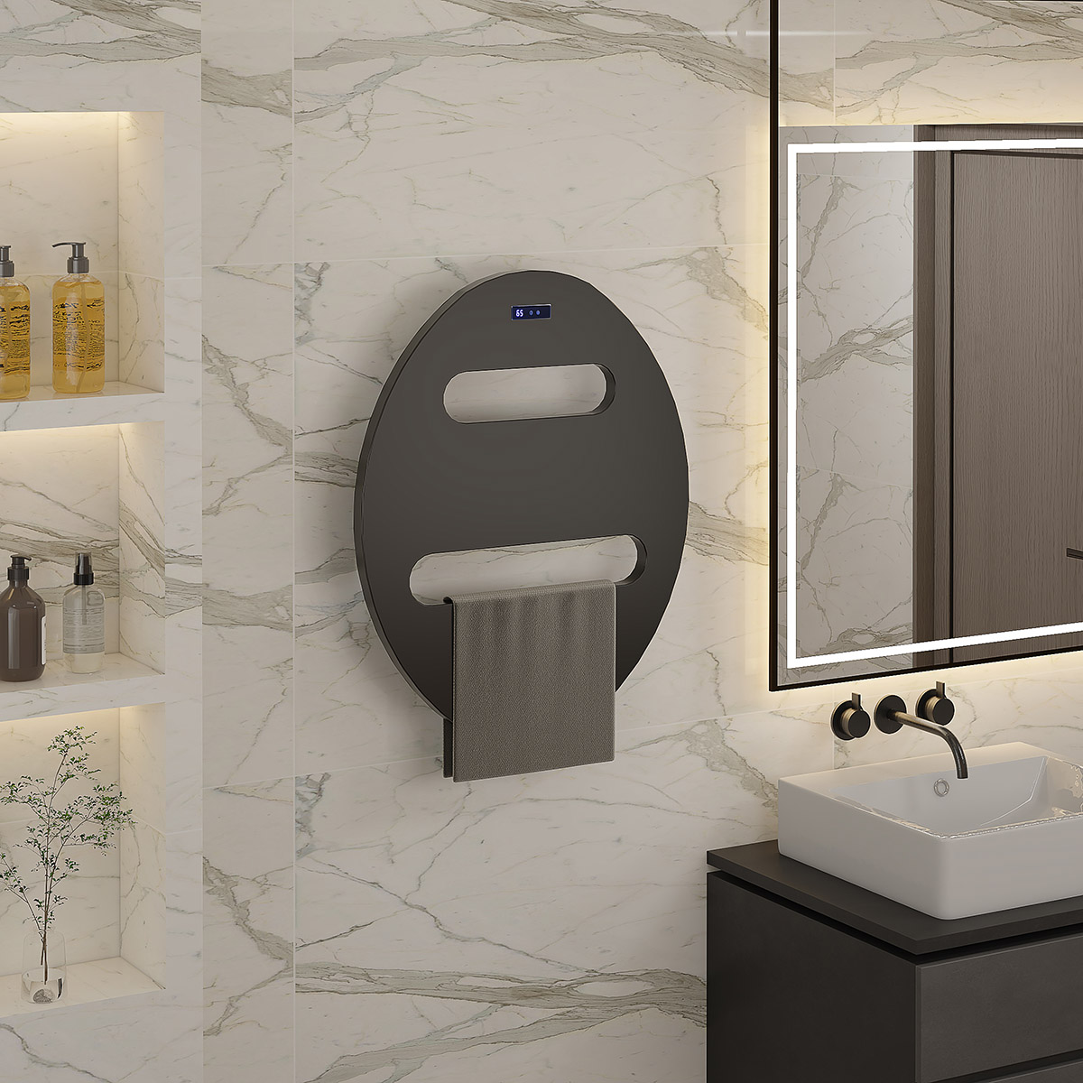 板式液顯多功能開關(guān)電熱毛巾架 Panel LCD display multifunction switch heated towel rail 材質(zhì)Material:Aluminum 鋁 功率Power:220V/130W 表面Surface:Black Painted 黑色噴塑 尺寸Size:600*90*800mm 包裝Ctn size:640*110*860mm