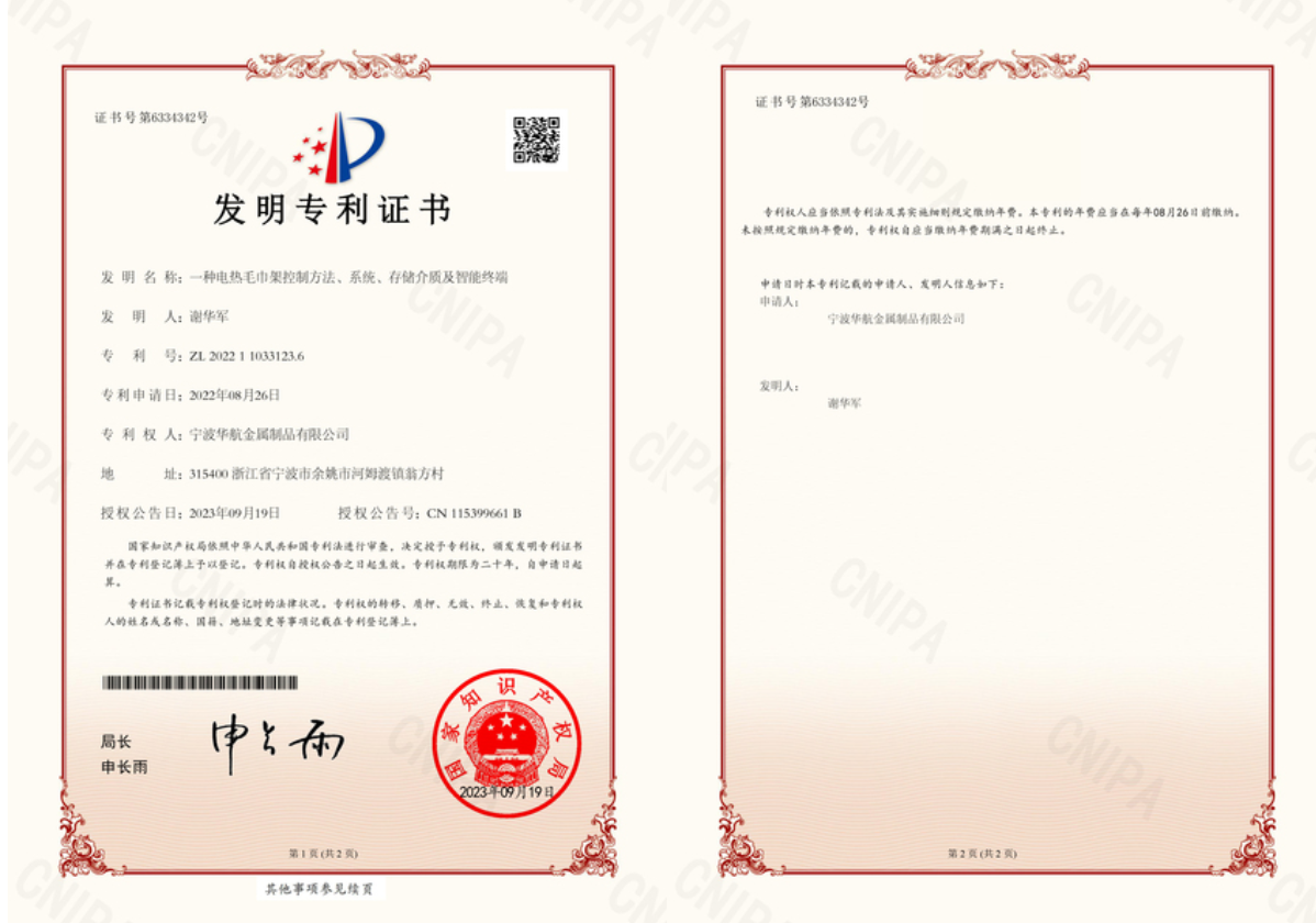 近日,由我司自主研發的“一種電熱毛巾架控制方法、系統、存儲介質及智能終端”喜獲國家知識產權局頒發的發明專利證書,這是我們技術研發的一次重大突破也是我們不懈努力和持續創新的見證。